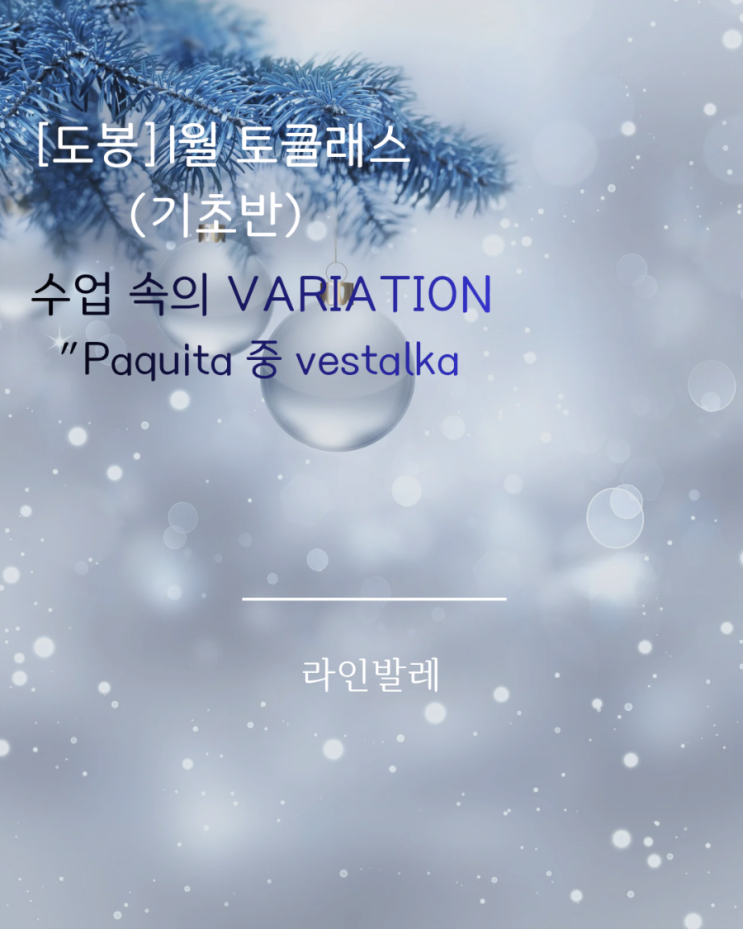 오랜만에 2026년 1월 토클래스는 "수업 속의 variation" 과 함께 합니다. 내년 1월 토클래스 Level 과 수업 시간 그리고 작품 안내드립니다. - ▪︎토클래스 Level : 라인발레 토클래스 Level 은 기초반입니다. ▪︎수업 시간 : 토요일 p.m. 3:00~4:10 ▪︎수업료 : 월 4회 10만원 ▪︎1월 수업 속의 variation 은 작품" Paquita" 중 "베스탈카(vestalka)"입니다. ✔️토클래스에서 작품 수업은 절대 메인 수업이 아닙니다. 작품 수업은 오롯이 토슈즈 연습에 도움이 되고자 진행합니다. ✔️토클래스 수업진행설명서 안내드립니다. <Bar - 슈즈> - warm up을 위한 tendu - plie - tendu 와 jete - rond de ....... <img src="https://blogthumb.pstatic.net/MjAyNTEyMjNfMjg5/MDAxNzY2NDk5NDE1MDgy.kPtKB40LA3M4hzMkrBR4xhM16lSR53dvMvdSotQnMSwg.R-mD43LSViJ4yE8PE3iA-Hz-3IO5ATxbiNPxyycB3Dgg.PNG/900%A3%DF%A3%DB%B5%B5%BA%C0%A3%DD1%BF%F9_%C5%E4%C5%AC%B7%A1%BD%BA%A3%DF20251223%A3%DF164810%A3%DF0000.png?type=s3" />