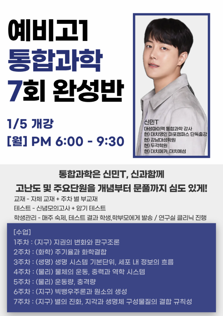통합 과학의 대세 대성 마이맥 온라인 신민T 마포명인 전격출강 무엇보다 신선한! 누구보다 신 들린! 누구나 신뢰할 수 있는! 통합 과학을 선보이다 ★ 신과 함께 PROJECT ★ COMING SOON …… 조기 마감 예상 …… [ 예비고1 통합과학 7회 완성반 ] (월) PM 6:00 - 9:30 1/5 대개강 [강좌 특징] ▶ 고난도 및 주요단원을 다룹니다. ▶ 기초개념부터 문제풀이까지 심도있게 학습합니다. ▶ 단계별 문제풀이와 대단원 모의고사를 통해 실력을 향상시킵니다. [교재/테스트] ▶ 자체교재 + 주차별 부교재 ▶ 신념 모의고사 (직전 수업 주요 문항) ▶ 암기 테스트 (지구,화학) [학생 관리] - 매주 숙제 검사와 테스트 결과를 학생, 학부모에게 발송 -....... <img src="https://blogthumb.pstatic.net/MjAyNTEyMThfMjE2/MDAxNzY2MDU4NTk3NjUx.WX9HCyw5dJ3do5VJCajw2y5uh4A8FANPb_Dcgpz-P0Mg.UA04jjyFcij_ffbJHnSFsX2x6EUSQ24crmAow4A2YZIg.PNG/%BD%C5%B9%CEt.png?type=s3" />