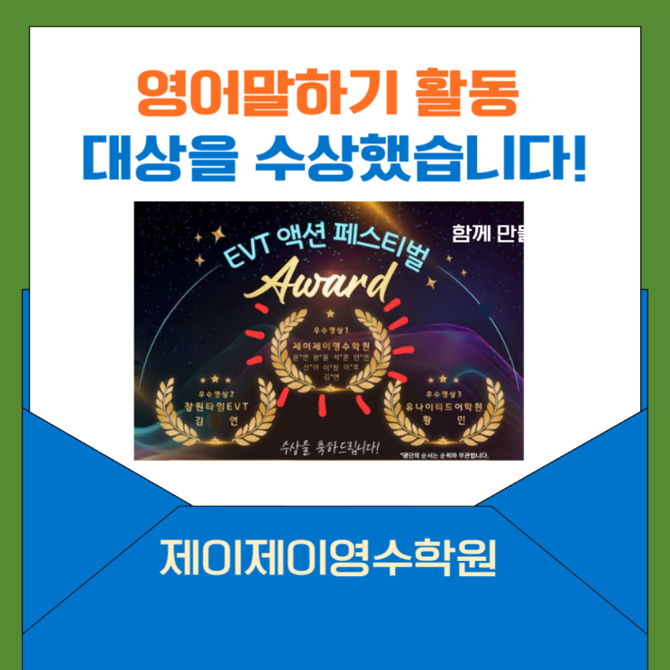 안녕하세요 제이제이영수학원입니다! 저희 제이제이영어에서는 파닉스가 아닌 영어보컬트레이닝을 통해서 영어원어민 발음 만들기 훈련을 진행하고 있는데 정말 아이들의 영어자신감이 제대로 올라가고 있습니다! <제이제이영수학원 말하기 활동> 특히나 저희 제이제이영어수학원의 초등부 학생들은 이번에 저희 전국의 영어원어민발음 전문 EVT에서 진행한 영어말하기 페스티벌에서 대상을 차지하였습니다! 전국의 수백개의 학원들에서 참여를 했는 데 저희 제이제이영수학원의 학생들이 대상을 차지하였습니다! 이러한 영어말하기의 자신감은 바로 영어학습에 있어서도 나타나고 있고 아이들은 자신감있게 영어학습을 진행하고 있습니다....... <img src="https://blogthumb.pstatic.net/MjAyNTEyMTlfMTgw/MDAxNzY2MTQ1ODQxODUy.xrG1UD6fTWlHe8mUEpqUJdfiwv_1etBsx1FAtnjnSVkg.NUS7k0zClnjr7FlxOxaJyw3uN46XY3RZzETFmko-viYg.PNG/%C1%A6%B8%F1%C0%BB_%C0%D4%B7%C2%C7%D8%C1%D6%BC%BC%BF%E4_-001_%2872%29.png?type=s3" />