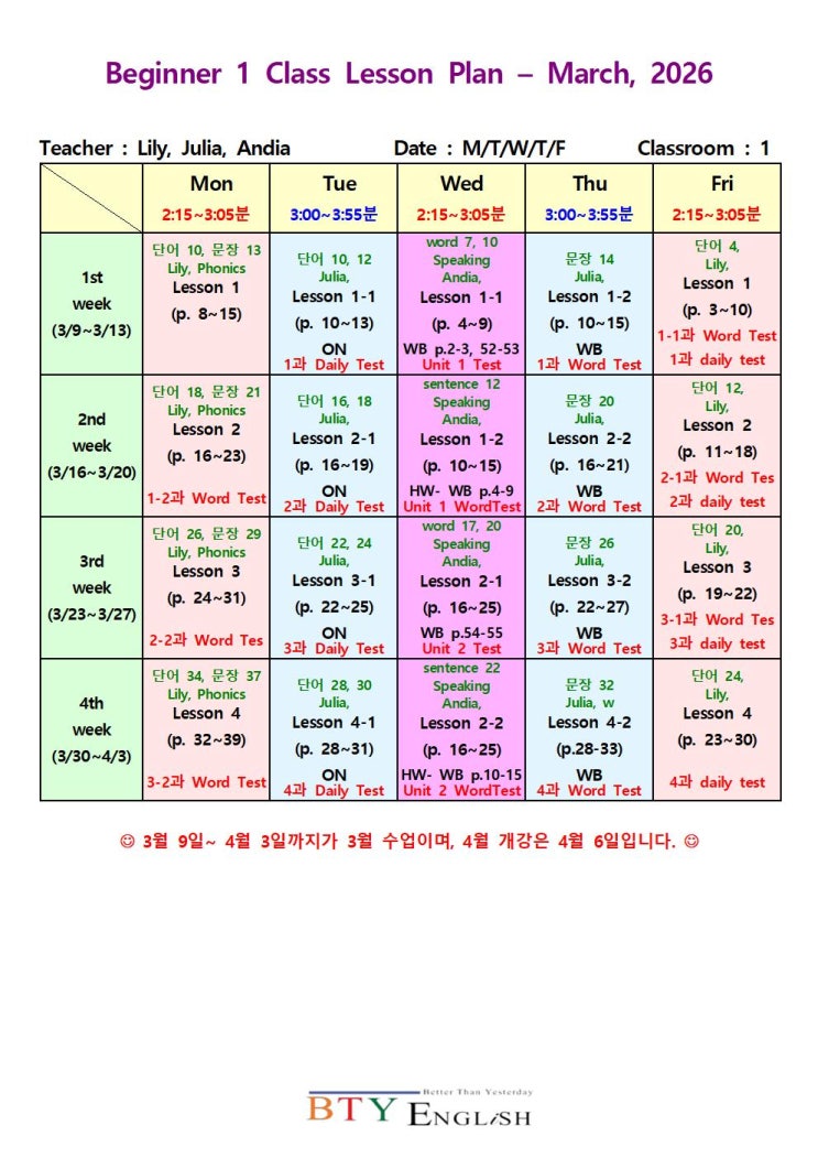 [비티와이 영어학원] 3월 스케줄표