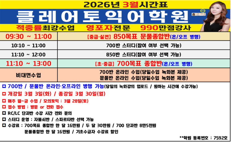 클레어토익 26년 3월 시간표 ✔️700반, 문풀반 오프라인/온라인 수업 자유롭게 병행 가능하니 학원에 나오지 못하는 날에는 편한 시간에 온라인 수강해주세요. ✔️스터디 전담 짱쌤이 가르쳐주는 무료 과외 스터디 (안 하면 손해!!) ✔️자물쇠반 : 단어시험+ 과제검사 ✔️스파르타반 : 단어시험 + 과제검사 + 짱쌤그룹수업 (왕초보반/기본반 선택) ✔️ 학원에서 자율학습 할 수 있어요 :) ✔️수강문의 010 2846 2401 <img src="https://blogthumb.pstatic.net/MjAyNjAyMTJfNyAg/MDAxNzcwODgxMzA1NzQ5.1EoPnZ2piIaFpEOLjYDX1ZSaQd31ICAG_dBuYJaPCTQg.Sf1sUU0oePuwDI6zNR1RV0t-s58SI4qpGjnYj_1Znz8g.PNG/26%B3%E2_3%BF%F9.png?type=s3" />