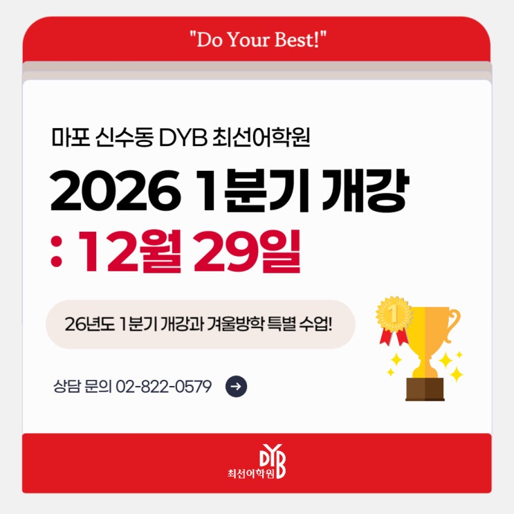 안녕하세요 DYB최선어학원 마포캠퍼스입니다. 2025년의 끝, 그리고 2026년을 준비하는 DYB 최선어학원 마포 캠퍼스! 2025년도 어느덧 끝자락에 다다랐습니다. 한 해 동안 DYB 최선어학원 마포캠퍼스를 믿고 함께해주신 학생들과 학부모님들께 진심으로 감사의 말씀을 전합니다. 저희 DYB 마포캠퍼스는 현재 다가오는 2026년도 1분기 개강과 새 학년을 대비해 커리큘럼 점검과 수업 준비에 집중하고 있습니다. 2026년도 1분기 개강 안내 개강일 : 2025년 12월 29일(월) 크리스마스를 보내고, 새해가 오기 전에 새 학년 학습을 한발 빠르게 시작합니다. 매년 1분기 개강 이후에는 방학 동안 학습 흐름을 끊기지 않도록 겨울방학 특강....... <img src="https://blogthumb.pstatic.net/MjAyNTEyMTdfMjkx/MDAxNzY1OTQyMjI5NTkx.XV0bpWZYKB7Alw8WEOSgLjnKz7NfDqCEzmo_SepXR3cg.iVjJgZTLkLIDEGZA-kRE6EhetQxU1KTxCh63Y02TXRAg.JPEG/%B8%B6%C6%F7_%BD%C5%BC%F6%B5%BF_%BF%B5%BE%EE%C7%D0%BF%F8_%282%29.jpg?type=s3" />