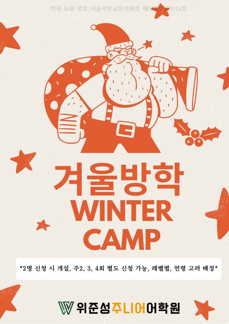 안녕하세요. 위준성주니어어학원입니다. ❄️ 겨울방학특강 Winter Camp 원어민 수업 안내 ❄️ 이번 겨울방학, 원어민 선생님과 함께하는 집중 영어 캠프가 시작됩니다! ✔️ 100% 영어 환경 ✔️ 실생활 중심 스피킹 & 액티비티 ✔️ 아이 눈높이에 맞춘 친절하고 에너지 넘치는 원어민 선생님 ✔️ 자연스럽게 말하는 자신감 UP! 놀이처럼 즐기며 듣고–말하고–표현하는 영어, 이번 겨울방학에 제대로 경험해보세요 ☃️✨ Winter Camp 신청은 아래 구글폼 작성후 제출해주시면 순차적으로 개별안내드립니다^^ https://forms.gle/m4FLaYUGaPBAJtht6 또는 전화 : 02-333-3583 / 010-2642-3583(위준성 원장 직통) 신청도 가능합니다 ^^....... <img src="https://blogthumb.pstatic.net/MjAyNTEyMTlfMTQ1/MDAxNzY2MTMyMjM2NjI2.P9dyR4nSIj52zfmVXbsHC08SoJog1RkiV45gsb_6mF8g.KPoxYsPCT-Kp_Ug9eNaTRD92uxBakmEc0bELNU21GXUg.JPEG/Red_Beige_Retro_Illustrative_Santa_Christmas_Party_Poster.jpg?type=s3" />
