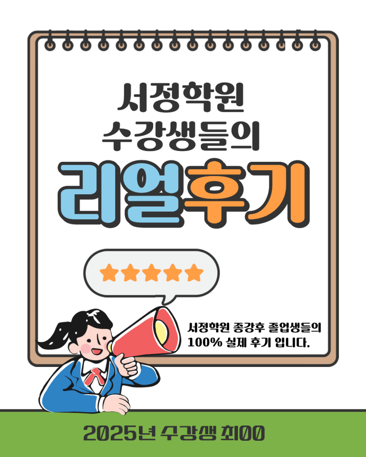 2025년 서정학원 종강후 100% 실제 수강한 학생의 후기입니다. 학생들의 피드백을 반영해 매년 성장하고 발전하며 학생들의 대학 입시에 최선의 노력을 다하겠습니다! <img src="https://blogthumb.pstatic.net/MjAyNTEyMTlfMjI2/MDAxNzY2MTMzMDUxMjk1.077oH8k4-JGV5YUpDqKpikyyq8He8Il5-qCzA1RLiVsg.738RipLX2mxjTDXjR8lHOh7878woZtNAl1cadVuNvk8g.PNG/1.png?type=s3" />
