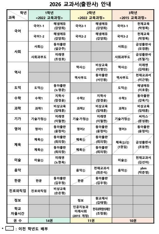 2026 중암중 교과서 출판사안내(영어출판사변경됨)