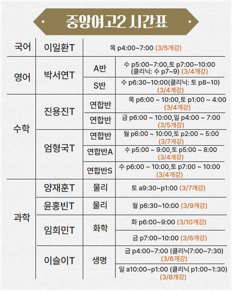 곧 2학년 새학기가 시작됩니다. 중앙여고 2학년 한해를 함께할 중앙여고 전담 선생님들과 힘차게 시작해 봅시다. 화이팅 상담 및 문의 ☎ 전화 문의: 02-313-3388 문자 문의: 010-3617-1469 <img src="https://blogthumb.pstatic.net/MjAyNjAyMjJfODMg/MDAxNzcxNzYyNTcxNjg3.lubv6aiILrqzfUdzFkfv0aXZaZ6bC-8k1zujg0pguqkg.GCM8i-i-LX7IDSSmGjX5DkdcW-ZJR8_15PU2mjunDgwg.PNG/%B0%ED2%BD%C3%B0%A3%C7%A5.png?type=s3" />