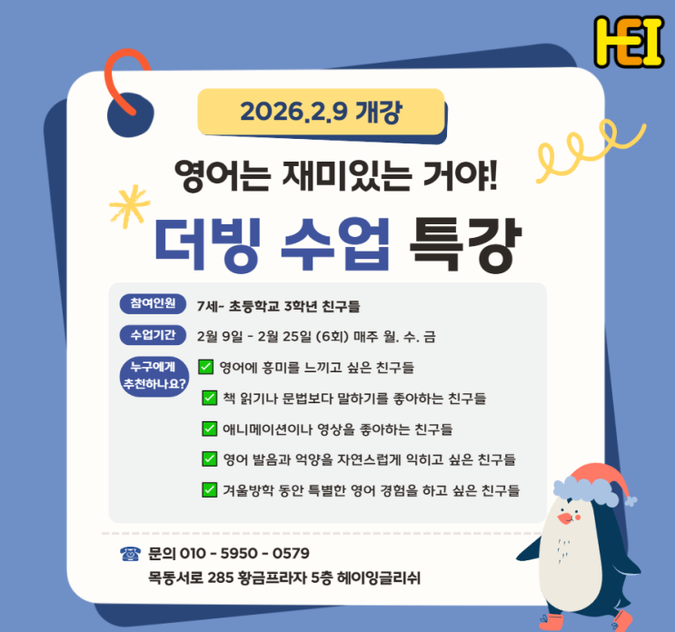 [서정초 목동초 ]2026년 2월, 특별한 영어 체험! HEI English 저학년 더빙 수업 특강 안내