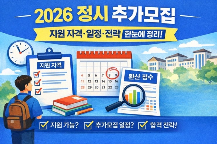 2026 대입 최후의 보루 ‘추가 모집’ 20일(어제부터) 시작 2026학년도 정시 모집 충원 합격자 발표가 마무리되면서, 이제 올해 대입의 마지막 관문인 **‘추가 모집’**이 어제부터 시작되었다. 수험생과 학부모님들께서 꼭 알아야 할 핵심 내용을 정리해 본다. 1. 추가 모집이란? 수시와 정시 모집이 모두 끝난 후에도 미등록 인원이 발생한 대학들이 결원을 채우기 위해 실시하는 **‘대입의 마지막 찬스’**다. 모든 대학이 실시하는 것이 아니므로, 본인이 희망하는 대학의 실시 여부를 확인하는 것이 첫걸음이다. 2. 2026학년도 추가 모집 일정 기간: 2026년 2월 20일(금) ~ 2월 27일(금) 특징: 원서 접수부터 합격자 발표, 등록까지 단 일....... <img src="https://blogthumb.pstatic.net/MjAyNjAyMjBfMTgy/MDAxNzcxNTc2ODA4NjEx.8-IusC2653CC8rM-_P-AXwwY0pfocir-NrO0DwXiKhMg.mMIoEnIMrKWF1S0Mkj-s_fmJGCbNL0_Oju6MGYTpRnkg.JPEG/%C8%AD%B8%E9_%C4%B8%C3%B3_2026-02-05_205951.jpg?type=s3" />