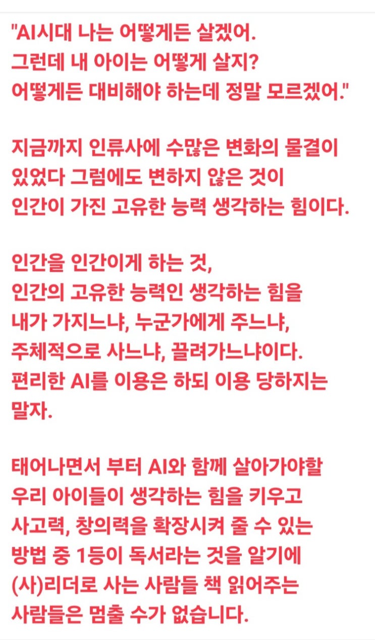 **오늘 둥지에서는** "그득그득 똘망똘망 도란도란" 꽃샘 추위라 걱정했는데 너무 씩씩하네요. 혼자, 친구와 그리고 부모님과 함께 들어오는 우리 친구들 반가워요. 교사님과 스탭님들 따뜻하게 맞이해 주셨습니다. 책을 좋아하는 아이, 책 맛을 통해 생각을 키우고 꿈을 찾아가는 2026년 (사)리더로 사는 사람들 "책 읽어주는 사람들" 풍성하게 출발했습니다. 배가 고프면 밥을 먹듯이 마음이 고프면 책을 먹어야 합니다. 어른이 되어서도 책을 좋아하는 사람이 되어 스스로의 그릇을 키우고 자기의 길을 걸어나갈 수 있었으면 좋겠습니다~^^ 꿈나무들의 웃음소리가 리사사 둥지를 가득 메워 주었네요. 함께 지켜보며 가정....... <img src="https://blogthumb.pstatic.net/MjAyNjAzMDdfMjAz/MDAxNzcyODgxMjk4NDEw.ayEMpMPhqo_AxzZ-GKv-HaRXD8o7XzSza5bnjkhM2HUg.e5xOAY9SxslW2TdSuDS_UupKN6NkLL9FwnewBcQdKAkg.JPEG/BandPhoto%A3%DF2026%A3%DF03%A3%DF07%A3%DF19%A3%DF33%A3%DF38%A3%DF2.jpg?type=s3" />