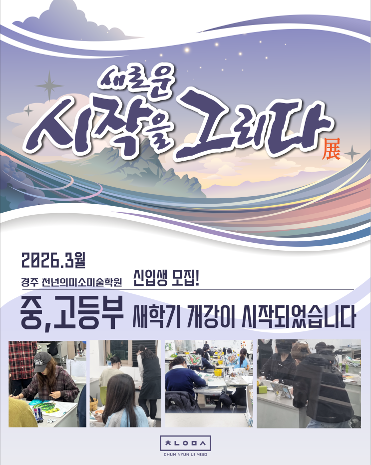 안녕하세요 :-) [서울본원직영] 경주천년의미소 미술학원입니다. 새로운 시작을 알리는 봄, 경주천년의미소와 함께 잠재력을 활짝 꽃피울 중‧고등부 신입생을 모집합니다 ♠ 막연한 꿈을 확실한 실력으로 만들어 가는 곳 ♠ "새로운 목표를 향한 시작, 올바른 방향설정이 가장 중요합니다" 중등부 탄탄한 기초부터 고등부 실전까지 완벽대비! 개개인의 장점을 극대화하는 맞춤형 커리큘럼으로 새 학기, 여러분의 잠재된 가능성을 실력으로 증명해드립니다. 수많은 합격데이터가 증명하는 경주천년의미소에서 2026년을 함께 시작하세요! 경주천년의미소 미술학원 상담문의 054) 745 - 5115 #경주미술학원 #경주중등미술학원 #경주중등....... <img src="https://blogthumb.pstatic.net/MjAyNjAzMDdfMzEg/MDAxNzcyODUwMjkwMDM1.5ZcaM8XrgIiLFqWS_-J6Aby83IIRwdVEmftYRGlVPtAg.M7keV6Th9ykkSsGuWEujFrxT1Nezp4f__WxGvAVdo90g.PNG/KakaoTalk_20260306_203547141.png?type=s3" />