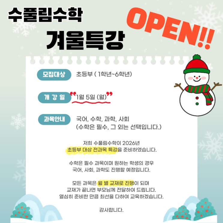 안녕하세요! 수풀림수학입니다 ㅎㅎ 많은 학생들이 선생님 ㅜㅜ 수학은 100점이 이제 나오는데 다른 과목이 힘들어요 ㅜㅜ 도와주세요!! 도움을 요청했습니다 ㅎㅎ 저희 학원 원장님은 원래 전과목을 수업하셨다가 혁신으로 이전하면서 수학과목만 진행하셨는데요! 학생들의 요구에 많은 고민 끝에! 전과목 수업을 OPEN하기로 결정하였습니다 ❤️ 저희는 수학뿐 아니라 국어, 사회, 과학도 추가로 강좌를 개설했으며 기존 교재와 마찬가지로 월 별 교재를 선택하여 학부모님들이 매 달 우리아이가 학습한 교재를 받아보실 수 있도록 진행하고 있습니다 ㅎㅎ (현재 수학 월 별 교재로 메릭스를 진행중 입니다!) 또한 이건 사실 비밀인데요!! ....... <img src="https://blogthumb.pstatic.net/MjAyNTEyMjBfNDYg/MDAxNzY2MTk0MjQ0MjM0.4XDyR9JlQy1ag9zLjfoVdnlwnn9rLYqhxevhc5H39lUg.z8gluXtg5-4-fQjUkcjCo7JpfjJvLhCU9AJxjm8KUDgg.PNG/%C1%A6%B8%F1%C0%BB-%C0%D4%B7%C2%C7%D8%C1%D6%BC%BC%BF%E4_-001_%2881%29.png?type=s3" />