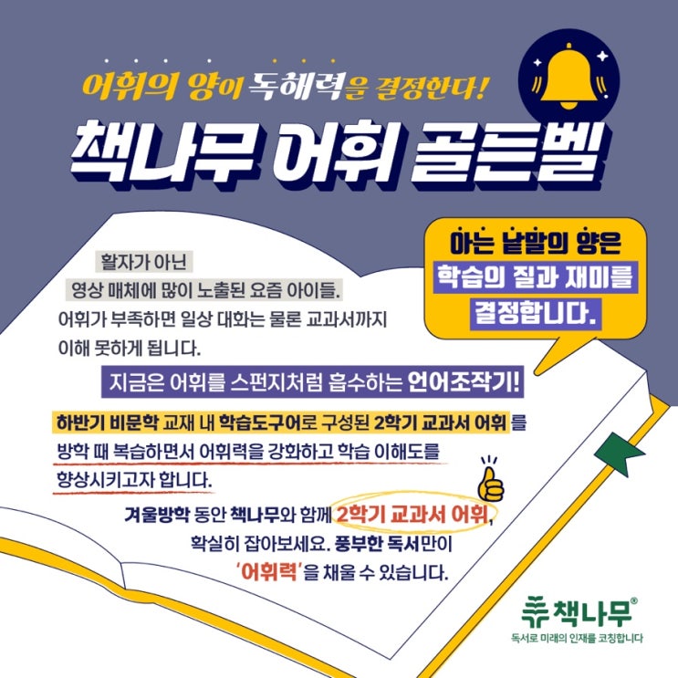 어휘의 양이 독해력을 결정합니다! 요즘 아이들, 책보다 영상 매체에 더 많이 노출되어 있지 않나요? 어휘를 정확히 알지 못하면 일상 대화는 물론 교과서 내용까지 제대로 이해하기 어려워집니다. 그래서 <책나무 구미 도봉점>에서는 책나무 어휘 골든벨로 2학기 교과서 어휘를 복습하는 시간을 가지고자 합니다. 겨울방학, 어휘가 실력이 되는 시간 겨울방학 동안 책나무와 함께 2학기 교과서 어휘를 정리하고 새 학기를 자신 있게! 시작하는 것은 어떨까요? 풍부한 '독서'만이 진짜 ‘어휘력’을 채울 수 있습니다. 책나무는 아이 한 명, 한 명의 언어 성장을 끝까지 책임집니다. 상담 및 문의 전화 / 문....... <img src="https://blogthumb.pstatic.net/MjAyNTEyMTlfMjky/MDAxNzY2MTM1NzE0Mjk3.5j7c7S5EUCAWjmcFc1a7eSeSYmOVm2eq88zbWFxT-sQg.b9dk6TwKiLGd1r2JIKKaETqONhI3aTV3sp0nqAPQChIg.JPEG/IMG%A3%DF0515.jpg?type=s3" />