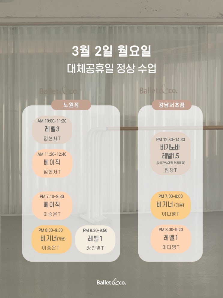 안녕하세요, 발레앤코입니다. 노원점과 강남서초점 3월 2일 월요일 대체공휴일 정상 수업 진행합니다 노원점 오전 클래스 ✔오전 10:00~ 11:20 / 레벨3 ( 고급난이도) ✔오전 11:20~12:40 / 베이직 (초급 난이도) 저녁 클래스 ✔저녁 7:10~8:30 / 베이직 (초급 난이도) ✔저녁8:30~9:30 / 비기너 (기초난이도) ✔저녁 8:30~9:50 / 레벨1 ( 초급 난이도) 강남서초점 오전 클래스 ✔오후12:30~2:30 / 바가노바 레벨1.5 (체험클래스 불가) ✔저녁 7:00~8:00 / 비기너 (기초난이도) ✔저녁 8:00~9:20 / 레벨1 ( 초급 난이도) 수강권 60분 클래스 : 1회 25,000원 80분 클래스 : 1회 32,000원 노원 | 노원구 상계로7길 39, 4층 ....... <img src="https://blogthumb.pstatic.net/MjAyNjAyMjNfMzAg/MDAxNzcxODM4NzQzMDY4.9mp3nQZJWG8Ysf9MpfK3gbLaGFXSGB6poQd_Y1oRx0kg.06f10IweICHOd0bx_WdTWVmX36dwbh4p5-vzDBTk5tsg.JPEG/26%C0%CE%BD%BA%C5%B8_%C1%A4%BB%F3%BC%F6%BE%F7.jpg?type=s3" />