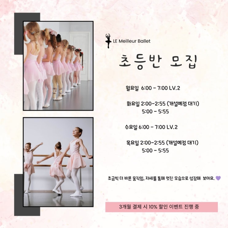 안녕하세요 르메이어 발레 아카데미 입니다. 긴 겨울방학이 이제 끝이나네요. 새 학기를 맞이하여 새롭게 초등반은 개설하려고 합니다. 한 걸음씩, 천천히. 아이들의 몸과 마음이 바르게 자라나는 시간. 르메이어 발레 초등반에서는 발레의 기본 동작부터 자세, 균형감, 표현력까지 아이의 성장 속도에 맞춰 섬세하게 지도합니다. 작은 움직임의 변화가 아이의 자신감 있는 모습으로 이어질 수 있도록 함께합니다. 클래스 안내 • 월요일 6:00–7:00 (LV.2) • 화요일 2:00–2:55 (개설예정 대기) / 5:00–5:55 • 수요일 6:00–7:00 (LV.2) • 목요일 2:00–2:55 (개설예정 대기) / 5:00–5:55 3개월 등록 시 10% 할인 이벤트 진행....... <img src="https://blogthumb.pstatic.net/MjAyNjAyMjRfMTAx/MDAxNzcxOTI3MjM1Njc1.9U__e8PPtnbnYQFSFwayAwiXM4a-Jfkb4A9lQF0oMiQg.kl_eZruAtlLCHF1lF2FwgEXFyn6Gf8n89TdxFn2BcJEg.JPEG/IMG%A3%DF6608.jpg?type=s3" />