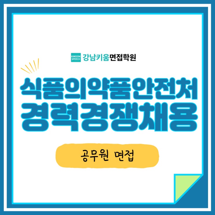 안녕하세요. 강남 키움 면접 학원입니다. 식약처 경력경쟁 채용이 진행중입니다. 1월 20일까지 원서 접수가 이루어졌고 3월 11일 서류전형 합격자 발표가 예정되어 있는데요. 서류 합격자 발표 이후 3월 23일 ~28일까지 면접 시험이 진행될 예정입니다. 채용 직렬은 약무직, 의료기술직, 보건연구사, 공업연구사 등으로 총 198명 채용이 예정되어 있습니다. 식약처 면접은 개인발표와 개별면접 두 가지 형태로 진행되는데요. 개인발표 이후 발표 내용에 대한 후속질문이 이어지고 이후 바로 개별면접으로 이어지는 형태입니다. 개인발표는 5분 스피치로 진행되며 주어진 주제와 관련하여 대안을 제시하는 유형입니다. 개별면접의 경우 자기소개서....... <img src="https://blogthumb.pstatic.net/MjAyNjAyMjRfMjU4/MDAxNzcxOTExNTA0Mzg0.kGuHkQY37SwdZ3-3-b8-gMtUDTtvhLaCfeE8t90n2zEg.ma7qib_kmSuCoHau6kHIUtjuOQG7kXPIcYRLbcaMFHQg.JPEG/001.jpg?type=s3" />