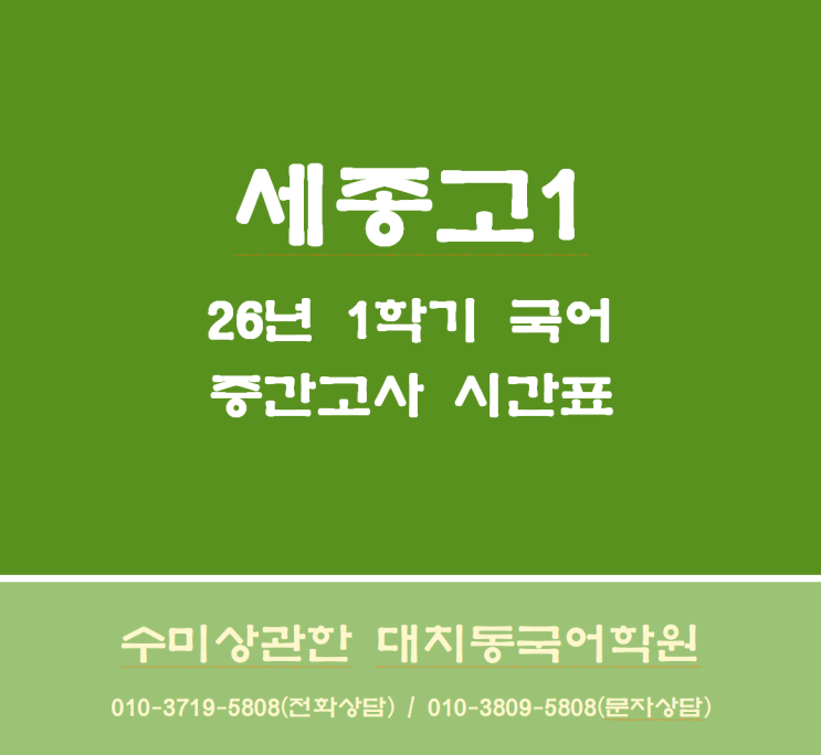 수미상관한 대치동국어학원의 '세종고' 1학년 국어내신은 토요일 2시~6시로 정했습니다 세종고는 수시전형 중심이라서 교과서를 중심으로 매년 모의고사 지문을 함께 사용하고 있습니다. 중간고사 시험범위에 2026년 3월에 치르는 국어모의고사가 시험범위에 들어갈 겁니다. 국어는 배경지식이 있어야 합니다. 그래서 겨울방학 동안 짧은 기간을 이용해서 최대한 기본 개념을 공부합니다. 요즘은 내신을 위해 대치동에 사는 학생들이 세종고, 풍문고 등으로 오기도 하는데, 이것도 때를 잘못 만나면 상위권 아이들이 몰려서 오히려 내신을 따는데 어려움이 있을 수도 있습니다. 세종고 1학년 국어내신 시간표 (토) 2시 ~ 6시 대형학원....... <img src="https://blogthumb.pstatic.net/MjAyNjAyMTBfMTM2/MDAxNzcwNjkzNTQzMTA2.blalkz6n0RgkEKRC4U_2Mg0S4vWttBs7jr43fiwqNr0g.R2YhfsX2N-2HLWhLRZluPGMzSjcejhh40xoDxtBROycg.PNG/%BD%BA%C5%A9%B8%B0%BC%A6_2026-02-10_115328.png?type=s3" />
