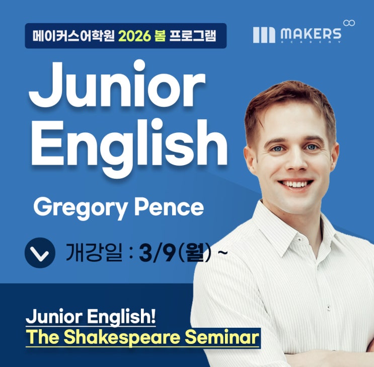 2026 메이커스어학원 Jr. English: The Shakespeare Seminar 봄방학 특강 3/9(월) 개강! Greg 선생님과 함께 제대로 읽는다면! Shakespeare는 절대로 어렵지 않습니다! [전화 문의] 02.6925.0038 [카톡 문의] http://pf.kakao.com/_CjSxdu 결과로 증명하는 우수한 강사진, 메이커스에서 확인해 보세요. 2026 Greg 선생님 소개영상 https://youtube.com/shorts/uQFtWtCbVCs?si=rLJQkhzvpHP0ajs3 여러분의 성공적인 학업 여정을 메이커스가 함께 하겠습니다. 수업 상담 및 신청은 메이커스어학원 공식채널을 통해 가능합니다. 문의 전화 : 02.6925.0038 카카오 채널: https://pf.kakao.com/_CjSxdu 메이커스어학원 신뢰의 이름, 메이커스....... <img src="https://blogthumb.pstatic.net/MjAyNjAyMTFfMjk5/MDAxNzcwODA5MDA2NzU3.y1Y_aj1IzTrjGqs4GImEViFHuRh7QAFUShCeygpcbwMg.nZzmyxY39IzyC6AKHV3ume4eTYNJXIj_maz8p91zvE8g.JPEG/KakaoTalk_20260211_142652751_01.jpg?type=s3" />
