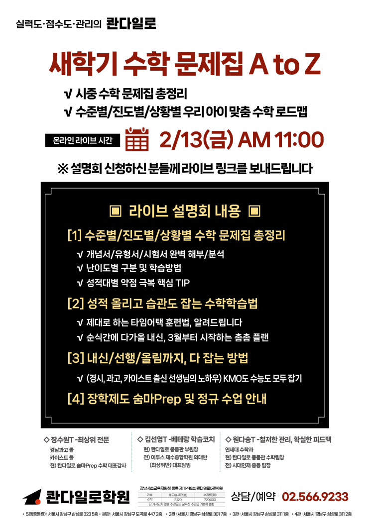 수학문제집, 그것이 알고 싶다!! 새학기 효과적인 학습을 위한 시중수학 문제집 분석!! 실시간 라이브 설명회로 찾아갑니다~ ★ 2/13(금) am11시 온라인 설명회 신청 ★ https://forms.gle/a6LStK2CtX2rZWqw5 ☎ 02-566-9233 / 010-7367-9234(문자전용) <img src="https://blogthumb.pstatic.net/MjAyNjAyMTBfMTcx/MDAxNzcwNzE5NjIzMDQ4.M4XIfBK2sCZzby87q3uhMnTzpEm45v_Wlyx-JtlTaCUg.L-UoFWcJHDU4FotX-IVMUdD4Z6tDYCWvzsn6DMukCxAg.PNG/KakaoTalk_20260210_192640551.png?type=s3" />