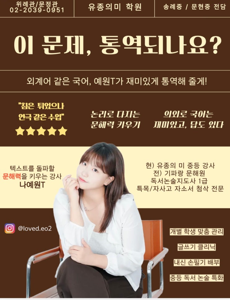 안녕하세요! 유종의미 중등 강사 나예원입니다. 탄탄한 정규 커리큘럼과 몇 년간 최상위 학생들과 같이 공부한 노하우가 담긴 수업 방식을 말씀드리러 왔어요. 1. 문해력 끌어올리기: 비문학 구조화, 시각화 (출처: 송례중, 문현중 재학생들) 구조화 숙제는 한 명 한 명 체크합니다. 모든 학생이 이 스킬을 가져갈 수 있도록 해요. 탄탄한 독해력은 난해한 내신과 모의고사에서도 크게 흔들리지 않습니다. 중등 국어 내신 100점이 중요한 게 아니라 평소에 '글을 얼마나 읽냐'를 중요하게 생각합니다. 2. 차별화된 독서 논술 커리큘럼 2, 3학년 1학년 * 내신 기간, 내신 범위에 따라 부분 변경될 수 있는 점 유의 부탁드립니다. - 내신....... <img src="https://blogthumb.pstatic.net/MjAyNjAyMjJfMjA5/MDAxNzcxNzUxMjgzMzE5.cwH3HDa_K0H7PER7PVKeQr0q9Z5svosyMoYiJ4sGipgg.AhVpEs30I1si_0SFTrX9KJH2dI5CHPLz47460KI5N78g.JPEG/KakaoTalk_20260222_174532486.jpg?type=s3" />