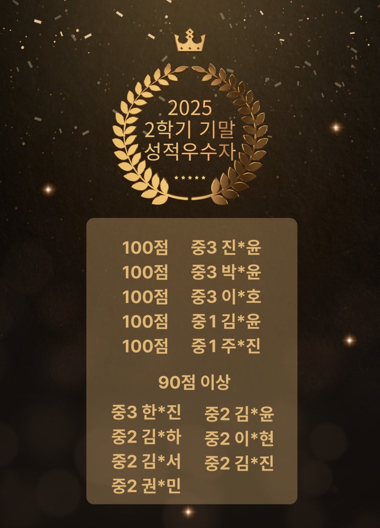 2025년 2학기 기말고사 성적 발표 100점을 축하합니다! 누구나 한 번쯤 받아 보고 싶은 점수, 100점. 하지만 요즘처럼 응용 문제가 강화되는 시험에서는 교과서를 단순히 암기하는 것만으로는 결코 쉽게 받을 수 있는 점수가 아닙니다. 시험은 이제 ‘얼마나 외웠는가’가 아니라 ‘얼마나 이해했는가’를 묻습니다. 기본기가 탄탄해야 응용된 문제 유형을 정확히 읽고, 스스로 풀어낼 수 있는 진짜 실력이 만들어집니다. 그리고 지난 기말고사에서도 와튼캠퍼스 학생들이 그 결과를 보여주었습니다. 100점 명단 양천중 3학년 진*윤 – 100점 이*호 – 100점 박*윤 – 100점 강신중 1학년 주*진 – 100점 양천중 1....... <img src="https://blogthumb.pstatic.net/MjAyNjAyMjVfMTgy/MDAxNzcyMDIyOTc1NDQw.-XYSlmq6xEtfzD8WOg2Q2zBiFDnvBjInnhguf7MLynUg.tvUkL5k2bTz0uz4sTYLgtBlJv8RB_F2LhvYWuppaX00g.JPEG/%C1%A6%B8%F1%C0%BB-%C0%D4%B7%C2%C7%D8%C1%D6%BC%BC%BF%E4_-004.jpg?type=s3" />