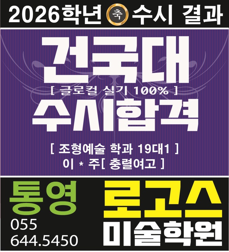 안녕하세요~ 통영 로고스 미술학원입니다! 오늘 정말 기쁜 소식을 들고 왔는데요! 바로 2026학년도 수시 합격 결과입니다ㅎㅎ 수시 건국대 글로컬은 실기 100% 학교입니다^^ "실기높은 대학의 합격은 곧 실기력입증" 정말 자랑스러운 결과입니다~~ 재현작이 준비 안되어 평소작을 대체 합니다 앞으로도 미대입시 실기 준비가 필요하다면, 로고스에서 전문적인 지도와 실력을 키워보세요! 지금까지 통영을 대표하는 로고스미술학원이였습니다. 앞으로도 다양한 소식들로 찾아오겠습니다. 통영미술학원/ 통영입시미술학원/통영애니학원/통영디자인학원/통영미대입시 <img src="https://blogthumb.pstatic.net/MjAyNTEyMTZfMjg2/MDAxNzY1ODc0NjkyMDU5.3eC6JX-GdaXfQ6XzUDpxc1j0WpVnRB27uFCy_I9ugKsg.-y2kmxKh4HTP0duSrNKuUOo0YYgrgzEKe6ljQ682GFYg.JPEG/2026%BC%F6%BD%C3_%B0%C7%B4%EB%B1%DB%B7%CE%C4%C3.jpg?type=s3" />
