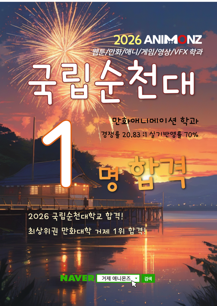 거제 만화/애니/게임/웹툰/VFX 입시전문 애니몬즈 만화학원 2026 국립순천대학교 합격 합격을 진심으로 축하드립니다. 입시생, 학부모님 여러분! 모두 고생 많으셨습니다. 입시학원 선택의 기준은 합격결과입니다. 합격결과로 증명하는 진짜 만화학원!! 거제 애니몬즈 미술학원 2026 애니몬즈 수시 합격 만화애니 최상위권(경쟁률 15: 1 이상)대학 거제내 애니몬즈 최다 합격! 애니몬즈 미술학원에는 거제 인근 지역의 많은 학생들이 통학 수강하고 있습니다. 금/토/일 주말 수업의 확대로 통학생들의 충분한 수강을 지원하고 있습니다. <img src="https://blogthumb.pstatic.net/MjAyNjAyMDhfMTU5/MDAxNzcwNDgwMDY1NzIw.DKLTVNDNb1Hx7u-M4q-_byfycyNGnbFoQxhZP-n_tK8g.TAj1UbYvdXTOQwehIZdKn17JfZnA_NhCWx8PGTgKDl8g.PNG/%B0%C5%C1%A6%B9%CC%BC%FA%C7%D0%BF%F8_%BE%D6%B4%CF%B8%F3%C1%EE%B8%B8%C8%AD%C7%D0%BF%F8_2026%C7%D5%B0%DD_%B1%B9%B8%B3%BC%F8%C3%B5%B4%EB%C7%D0%B1%B3.png?type=s3" />