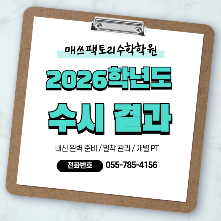 2026학년도 대입 수시모집 전형이 마무리되었습니다. 올해 저희 #매쓰팩토리 재원생들도 좋은 결과를 얻었습니다. 이어질 다음 대입에서도 좋은 결과를 얻을 수 있도록 최선을 다해서 지도하겠습니다. 지금부터 멋진 대학 생활을 누릴 자랑스러운 친구들을 소개하겠습니다. 예비 고등부터 3년 동안 열심히 따라와 준 학생입니다. 여고에서 줄 곳 내신 1등급을 놓치지 않은 성실한 친구인데 이번에 아주 좋은 결과를 얻었습니다. 바라던 수학교사가 되어서 멋진 꿈을 펼치기를!!!! 외고 특성상 수학이 주요 과목이 될 수 없는데도 열심히 내신을 준비하면서 창업 동아리 활동도 열심히 한 친구입니다. 성실한 학교생활의 결과로 관련 학과에 우수....... <img src="https://blogthumb.pstatic.net/MjAyNTEyMjdfMTg5/MDAxNzY2Nzk1NzU1OTYz.mtU07J6-epOC5zhBjHKHunE_dYPFklAJQvx1jmt9B1Eg.a6dZNnMup6P30-mmub6qT-8gjNI0UgKxh7Vx8lU9Je4g.PNG/%C1%A6%B8%F1%C0%BB-%C0%D4%B7%C2%C7%D8%C1%D6%BC%BC%BF%E4_-001_%286%29.png?type=s3" />