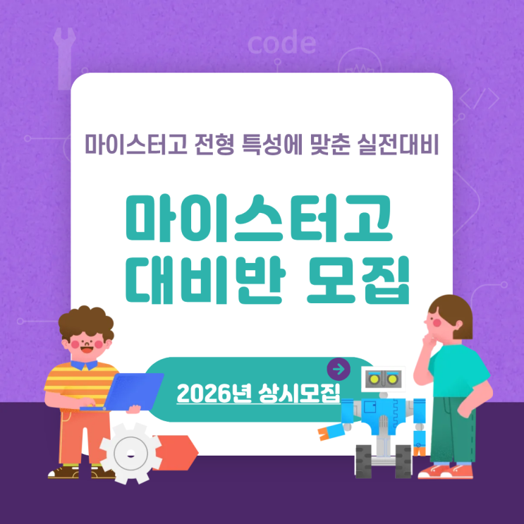 ⭐ 2026년 마이스터고 대비반 모집 양산 인공지능 고등학교 & 부산 소프트웨어 마이스터고 입시 총정리 2026학년도 고입을 준비하는 중3 학생·학부모님들이 가장 많이 찾는 학교는 바로 양산 인공지능고등학교(양산 AI고)와 부산소프트웨어마이스터고등학교입니다. 두 학교 모두 ✔ 미래 산업 중심 ✔ 취업·전문기술 중심 ✔ 실무형 교육을 제공하는 인기 특성화·마이스터고로, 경쟁률이 매년 상승하고 있어요. 이번 글에서는 학교 특징 2026 입학전형 정보 합격 전략 대비반 모집 안내 까지 한 번에 정리해드립니다. 1. 양산 인공지능고등학교(양산 AI고) — 2026 입시 정보 (경남 최초 AI 특성화 신설학교) ■ 학....... <img src="https://blogthumb.pstatic.net/MjAyNjAyMjNfMTYw/MDAxNzcxODQ3OTY5Njg3.VrZfOz_rwK8WBDQVIILKxMzW9twIBA3zUHVQnp4nhjEg.s6NmGPZeA49wLiZc8pmjQzzkutcPcM4FBhJsLB3DGAQg.PNG/%C1%A6%B8%F1%C0%BB_%C0%D4%B7%C2%C7%D8%C1%D6%BC%BC%BF%E4..png?type=s3" />