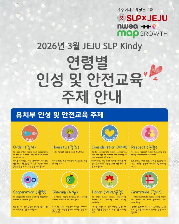 영어 실력만큼 중요한 가치교육! JEJU SLP Kindy 2026년 3월 「인성·안전교육」 주제 안내