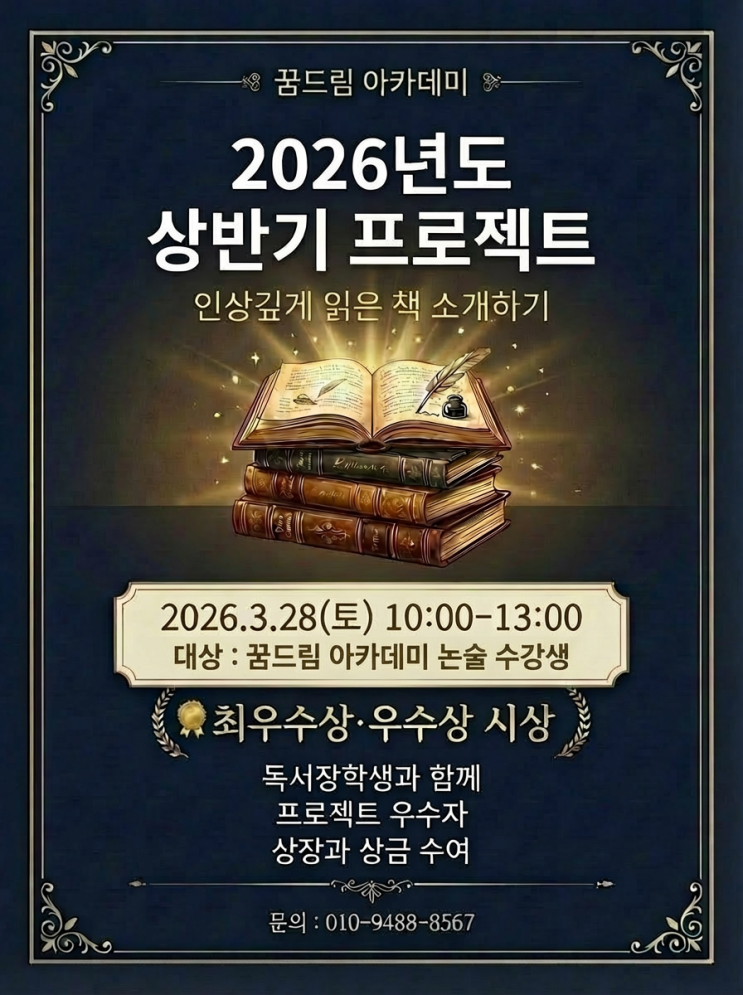 2026년도 상반기 프로젝트 "인상깊게 읽은 책 소개하기" 안녕하세요 꿈드림 아카데미입니다. 꿈드림 아카데미에서 특별한 프로젝트를 준비했어요! 바로 독서장학생 선발 프로젝트와 인상깊게 읽은 책을 소개하는 발표 프로젝트입니다. 독서장학생 선발 프로젝트 지난 12월 중순부터 시작한 독서장학생 선발 프로젝트가 2월 말에 종료될 예정입니다. 방학 기간 동안 우리 아이들은 꾸준히 책을 읽고 독서감상문을 작성해 왔어요. 심사를 거쳐 최우수 장학생과 우수 장학생을 선발하여 상장과 상금을 지급할 예정입니다! 2026년도 상반기 프로젝트 이번 프로젝트에서는 방학 기간 중에 읽었던 책 중에서 가장 인상 깊게 읽은 책....... <img src="https://blogthumb.pstatic.net/MjAyNjAyMjNfMjUy/MDAxNzcxODMyMzc1NDk2.nBLejwHsdny5gLeG8l99Bvgid3UGRDxML5goq6iuCVsg.kgnLSo2EbWaHDBNvAcpKv7i4YOeB1goILMKPOiYSPLYg.PNG/%C6%F7%BD%BA%C5%CD.png?type=s3" />