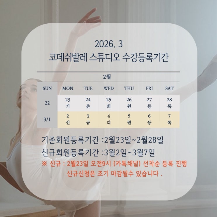 코데쉬발레 3월 수강 일정 안내 따뜻한 봄기운이 조금씩 느껴지는 3월이 다가왔습니다. 새로운 시작의 계절인 만큼, 몸과 마음을 정돈하며 다시 한 걸음 나아가는 시간이 되시길 바랍니다. 3월 수강 일정 및 등록 안내드립니다. 자세한 수강등록 방법은 아래 참고해주세요! 3월 수업 일정 안내 •3월 수업은 정규 시간표에 따라 정상 진행됩니다. •반별 정원제로 운영되며, 선착순 등록 마감됩니다. •반 변경을 원하시는 경우 미리 문의 부탁드립니다. 문의 및 채널 안내 •카카오톡 채널 : 코데쉬발레 •전화 상담 가능 시간 : 오전 10시 ~ 오후 6시 코데쉬 발레 스튜디오는 바가노바 메소드를 기반으로 한 전통 클래식 발레 전....... <img src="https://blogthumb.pstatic.net/MjAyNjAyMTVfODcg/MDAxNzcxMTMzMjU0ODE0.-XD2HfIOYuKNibC08h2G7uyRh43tXxX33ih9NM8ddEYg.re8nIviHq7PdpkrUTsQyCy8ZAcIqMZQpwottqMH2i1Qg.JPEG/IMG%A3%DF3286.JPG?type=s3" />