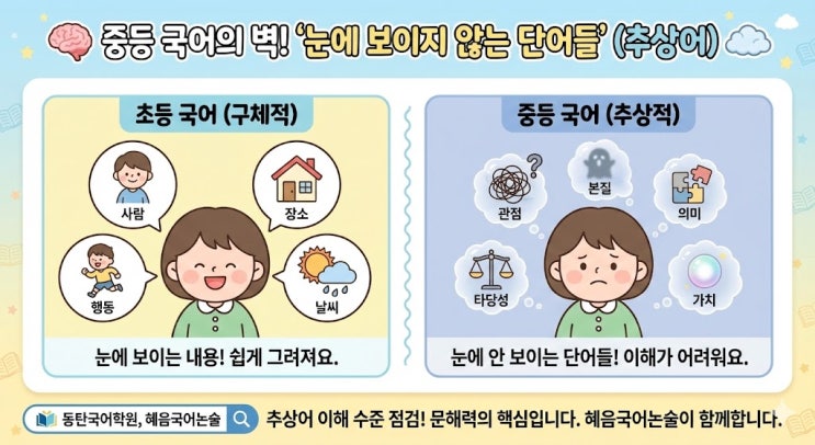 안녕하세요. 동탄국어학원 혜음국어논술 매일문해력센터입니다 :) 초등 때는 국어가 비교적 쉬웠다고 느끼던 아이들이 중학생이 되면 갑자기 어렵다고 말합니다. “지문이 이해가 안 돼요.” “무슨 말인지 잘 모르겠어요.” 동탄국어학원 상담에서 가장 많이 듣는 말 중 하나입니다. 그 이유는 단순합니다. 중등 국어부터는 ‘추상어’가 급격히 늘어나기 때문입니다. 혜음국어논술에서는 이 지점을 중등 국어의 분기점으로 봅니다. 눈에 보이지 않는 단어들이 많아집니다 초등 국어는 비교적 구체적입니다. 사람, 사건, 행동처럼 눈에 그려지는 내용이 많습니다. 하지만 중학생이 되면 ‘가치’, ‘관점’, ‘본질’, ‘의미’, ‘타당성’처럼....... <img src="https://blogthumb.pstatic.net/MjAyNjAyMjNfMTkw/MDAxNzcxODM3Nzc4MTA0.2gCyQAKBxusjZNXS327bKLZLWJMh6tPh2wH8YXf1PQEg.LWMFPtIQW1CZkE41TsI-4PSFaz0GykcQfwg-an2YKicg.JPEG/unnamed.jpg?type=s3" />