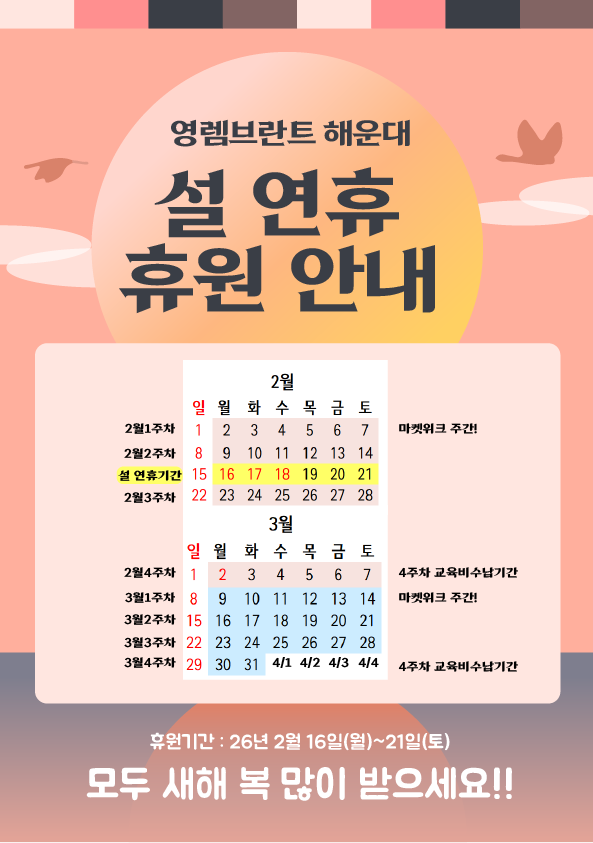 2월 16일~21일은 앞으로의 수업을 연구개발을 하기 위해 한 주간 쉬어가는 주간입니다. 2월4주차 수업은 3월3일부터 진행됩니다. 언제나 최고의 수업을 할 수 있도록 한 주간 깊게 연구를 진행토록 하겠습니다. 감사합니다♡ 우리 아이의 미술학원 선택의 기준 3가지! 1. 전공자 선생님이 지도하는 곳인가 2.드로잉의 원리를 자연스럽게 알려줄 수 있는가 3.선생님 대비 학생수 1. 영렘브란트 해운대 미술학원은 5명의 선생님 모두 전공자이며 원장은 교육대학원 졸업 및 교원자격증을 보유하고 있습니다. 2. 미술시간을 그저 놀이시간으로 때우지 않습니다. 원장과 선생님들은 검증된 교육지도안을 토대로 재원생들의 눈높이에 맞추어 연구를 하....... <img src="https://blogthumb.pstatic.net/MjAyNjAyMDZfMjI4/MDAxNzcwMzU0MzI5ODkx.T2EwFeQHNkHDN4kV8qi6_R5qnA52mpXyeYpQ3aZ4Hfkg.BREJNE3Tr3-aJ3z0k5vsSu-ggZ8Mv0kd_ic54NoOhsQg.PNG/%C0%DA%BB%EA_1.png?type=s3" />