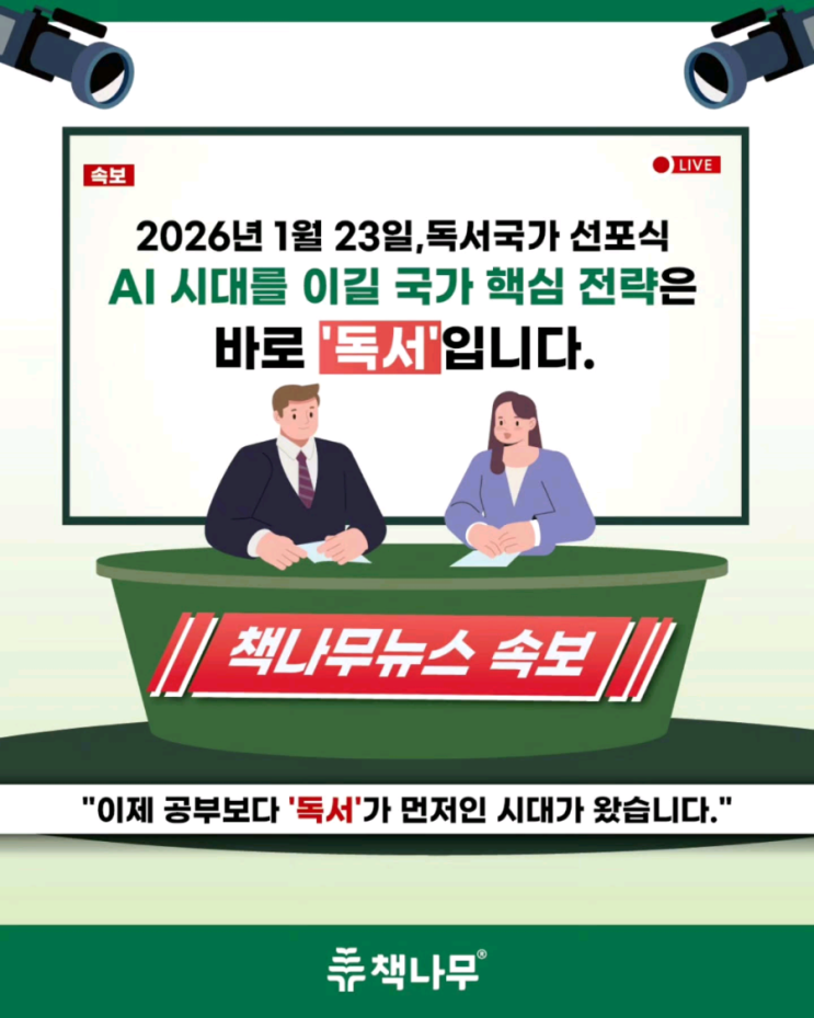 AI시대 우리아이는 무엇을 준비해야 할까요? 이제는 공부보다 먼저 읽고 생각하는 힘이 중요해진 시대입니다. 26년 1월 23일 국회의원회관에서 'AI시대 독서국가로 가는 길'을 주제로 독서국가 선포식이 열렸습니다. 이번 선포식은 AI시대를 대비해 독서의 중요성을 국가 차원에서 강조한 자리였습니다. AI가 알아서 정보를 찾아주는 시대 정보를 이해하는 힘 비판적으로 생각하는 힘 나만의 질문을 던지는 힘 AI시대에 더욱 필요한 이러한 힘은 아이 스스로 길러야할 역량입니다. 그래서 독서도 달라져야 합니다. 단순히 많이 읽는 독서가 아니라 이해하고 생각하고 표현하는 독서로요! 책나무는 오래전부터 꾸준히 문해력 진단을 바....... <img src="https://blogthumb.pstatic.net/MjAyNjAyMTNfMjM3/MDAxNzcwOTUyNTM4MDcy.5jMtQhwb6sWJRAEYpXs_Z8sjQlfX427n0TQQuZ7b0VQg.OTMkKhyBxD8LzOu_csLE1lvbonA_SRX8HPtrV-5mS30g.PNG/900%A3%DFDUE3BrAk%A3%ADFR%A3%DF4.png?type=s3" />