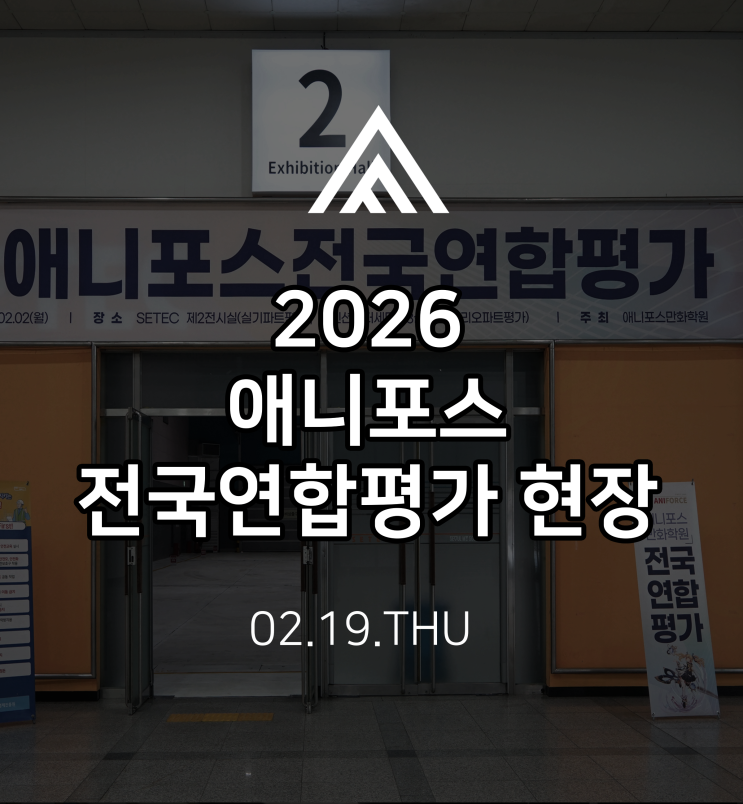 안녕하세요. 해운대 애니포스 만화학원입니다. 오늘은 SETEC 컨벤션센터에서 진행된 2026년 애니포스 전국연합평가 현장 이야기를 전해드립니다. 애니입시와 게임입시 등을 준비하는 학생들에게 이번 평가는 현재 실력을 점검하고 앞으로의 1년 입시 전략을 구체화하는 중요한 출발점이 되었습니다. 이번 전국 연합모의고사는 오전부터 SETEC 제2전시실과 컨벤션센터 세미나3실에서 진행되었습니다. SETEC 제2전시실 https://naver.me/xY4yCJMS SETEC 컨벤션센터 세미나 3실 https://naver.me/GyYn1azv 안정적이고 쾌적한 환경 속에서 평가가 이루어졌습니다. 이번 평가는 고1·고2 학생을 대상으로, 애니고·웹툰고·예고 입시를 준비 중인 학생들....... <img src="https://blogthumb.pstatic.net/MjAyNjAyMTlfMTcz/MDAxNzcxNDk2OTc2Mjc4.zytiedHyI_IezjhXcVr9H7pDfZ3h2eicZeuJNDN23Rkg.7GAi9veQ22569pEA_i_ShhNnqHg0yrbGkRfbUpSptukg.PNG/%BA%ED%B7%CE%B1%D7_%BD%E6%B3%D7%C0%CF%28%C1%A4%BB%E7%B0%A2%C7%FC%29.png?type=s3" />