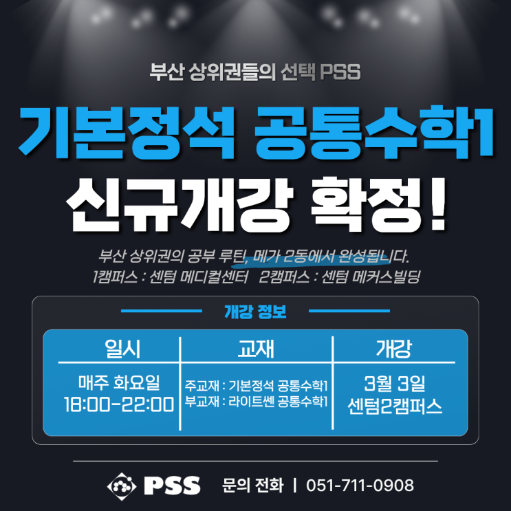 PSS 센텀2캠퍼스 고등 판서 신규개강 안내드립니다. ▶기본정석 공통수학1 • 개강: 3월 3일(화) • 시간: 18:00-22:00 • 장소: 센텀2캠퍼스 • 교재: 기본정석, 라이트쎈 공통수학1 상담 문의는 각 캠퍼스로 연락주시면 안내도와드리겠습니다. [캠퍼스 안내] ■ PSS 센텀1캠퍼스 번호 ㅣ 051-991-0907 주소 ㅣ 부산시 해운대구 센텀2로 10 메디컬센터 7층 ■ PSS 센텀2캠퍼스 번호ㅣ 051-711-0908 주소ㅣ 부산시 해운대구 센텀2로 29 메커스빌딩 6층 ■ PSS 장산캠퍼스 번호ㅣ 051-908-0909 주소ㅣ 부산시 해운대구 세실로 43 경동코아 8층 <img src="https://blogthumb.pstatic.net/MjAyNjAyMTlfMjIx/MDAxNzcxNDgzNTI2ODg5.rvQR-K6jop-r8JsIdo7fVw8PVgVN5qnqfotJierLVLsg.f9yXhbjPMCn2vjT_kZB43oYx3NJNZ8lZTxF1CWUlFJUg.PNG/1.png?type=s3" />