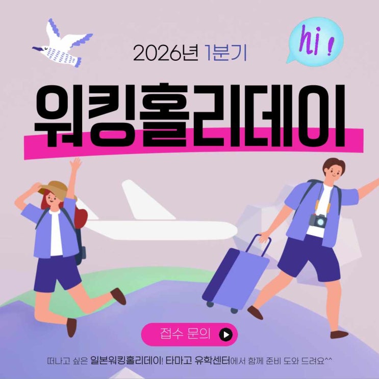 일본에서의 새로운 도전을 꿈꾸시나요? ✈️ 타마고 일본어학원에서 일본 워킹홀리데이 1분기 접수 대행을 진행합니다! 1분기 접수 기간 : 1월 5일 ~ 22일(16일 신청마감) 대상 : 만 18세~30세 대한민국 국민 지원 가능 지역 : 도쿄 / 오사카 / 후쿠오카 등 대행 서비스 내용 1. 지원 서류 검토 및 지원 2. 인터뷰 대비 3. 비자 신청 절차 안내 타마고 유학센터에서 다수의 합격 경험을 바탕으로 처음 준비하시는 분들도 꼼꼼하게 도와드립니다 지금 카카오채널이나 DM으로 상담 신청하시고 2026년, 일본에서의 첫걸음을 함께 준비해요 ✨ #타마고일본어학원 #부산일본어학원 #사하일본어 #사하구일본어학원 #명지일본....... <img src="https://phinf.pstatic.net/image.nmv/blog_2026_01_07_1304/hte7qW1AMG_06.jpg?type=f480x480" />