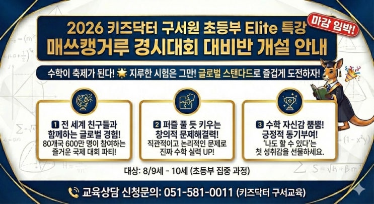 2026 매쓰캥거루 초등부 Elite 경시대비반 안내 안녕하세요. 창의성영재교육 키즈닥터 구서원입니다. 올해 5월, 전 세계 80개국 600만 명 이상이 함께 도전하는 국제 수학 경시대회, 매쓰캥거루(Math Kangaroo) 가 진행됩니다. 구서키즈닥터에서는 이 대회를 준비하는 초등 친구들을 위해 3월 2026 매쓰캥거루 초등부 Elite 경시대비반을 개설합니다. 매쓰캥거루, 왜 특별할까요? • 전 세계 친구들과 함께 치르는 글로벌 수학 파티 • 단순 계산이 아니라 사고력·추론력을 요구하는 창의 문제 중심 • “나도 할 수 있다”는 수학 자신감과 성취감을 키워 주는 국제 대회 지루한 시험이 아니라, 즐겁게 도전하는 글로벌 스탠다드 수학 축제입니....... <img src="https://blogthumb.pstatic.net/MjAyNjAyMThfMjIg/MDAxNzcxNDA1OTkyOTA5.qjVP5fSJt8g0IV9Q9FKB195VtsGNGZsu4kKYA2ZzadMg.4c5KcQ3q5SW6ca2A-GNCX-fnAJ_cIn7Aq9bmKLgH6o4g.JPEG/IMG%A3%DF2170.jpg?type=s3" />
