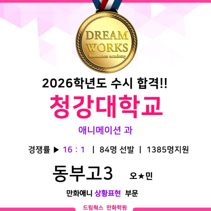 청강문화대학교 , 청강문화산업대학교 , 청강대학교 애니콘텐츠 스쿨 / 애니메이션과 합격 축하드립니다! 청강대 이미지보드 시험 합격!! 상황표현 / 칸만화 입시 시험 합격!! 대구 애니 학원 만화 학원 캐릭터 디자인학원! 일러스트 캐릭터 디자인도 ! 일러스트 웹툰 애니메이션도! 드림웍스 만화학원과 함께 하세요!! 여러분에 꿈을 위해 최선을 다하는 학원 입니다!! <img src="https://blogthumb.pstatic.net/MjAyNjAzMDVfMTU4/MDAxNzcyNjg4NzM2Nzkz.cMHMU0VG8nvD2sMrEOHGSP-spSEJHIvstEsJxVpYt_wg.UaRjZS870BFaKGFzGejiZkyHlPLvJEuupLQJcZnBOQgg.JPEG/12_%281%29.jpg?type=s3" />