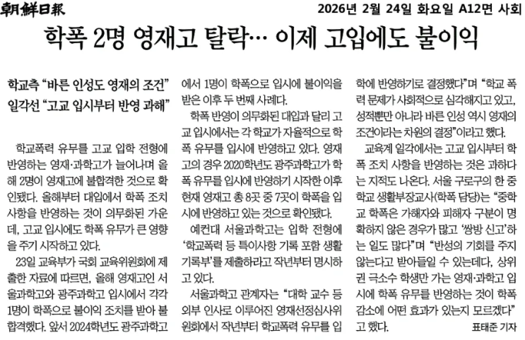 학교폭력 이력, 이제 ‘고입’에서도 반영됩니다 우리 아이 중학교 생활, 지금부터가 진짜 중요합니다 안녕하세요. GnB이곡어학원 본부직영입니다. 최근 보도에 따르면, 학교폭력 이력이 영재고·과학고 입시에서 실제로 불이익 요인으로 작용해 올해 2명이 영재고 진학에 불합격한 사례가 확인되었습니다. 이제 학교폭력 문제는 단순한 ‘학교 안의 문제’가 아니라, 고등학교 진학과 이후 진로까지 직접적인 영향을 주는 중요한 요소가 되었습니다. 성적만으로는 설명되지 않는 시대 많은 학부모님들께서 “공부만 잘하면 되지 않을까?”라고 생각하실 수 있습니다. 하지만 최근 입시 흐름은 분명합니다. 성적 + 태도 + 학교생활 + 인성 + 생활....... <img src="https://blogthumb.pstatic.net/MjAyNjAyMjRfNDgg/MDAxNzcxOTE2MDk0NzQ0.sX8Aek4kJM0dPZxq0QZSbYIwJBhGYVp5AREGrrHcAKog.tEGDTJn_uuJMow7nIA0u1ZhZY_JXLkZfZBNcPxycW90g.PNG/900%A3%DF1771915462575.png?type=s3" />