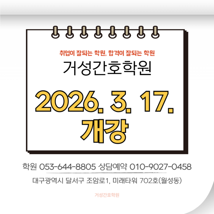 간호조무사 자격증반 봄학기 안내 개강일: 2026년 3월 17일 화요일 교육기간: 총 10.5개월 (이론 5개월 + 병원실습 4.5개월 + 방학 2회 포함) 수강대상: 고졸 이상 누구나/성별, 나이 제한 없음 선착순 모집중 달서구간호조무사 자격증 준비, 대구간호학원을 찾고 계신다면 거성간호학원입니다! 거성간호학원은 대구간호학원 중에서도 15년 이상 운영 경력을 가진 전문 교육기관으로 그동안 2,000명 이상의 수료생을 배출해온 곳입니다. 특히 현장 경험이 풍부한 간호사 출신 강사진으로 구성되어 있어 실무 중심 교육이 강점으로 꼽히고 있습니다. 임상 경력 간호사, 강의 경력 10년 이상 강사진 등 탄탄한 교육 이력을 갖춘 교수진이 직접 수업....... <img src="https://blogthumb.pstatic.net/MjAyNjAyMjVfOTcg/MDAxNzcyMDAyMjM1MzI4.e0GYGhzJXoOkf2fTKMOdH-KHpydvDl0s9V7MPmXhigMg.lJLIAiaiWhiHeRzM1VLy0mqpBzokGeibDHK0gPBPViUg.PNG/%B0%C5%BC%BA%B0%A3%C8%A3%C7%D0%BF%F8_%BD%E6%B3%D7%C0%CF_2026%BA%BD%C7%D0%B1%E2.png?type=s3" />