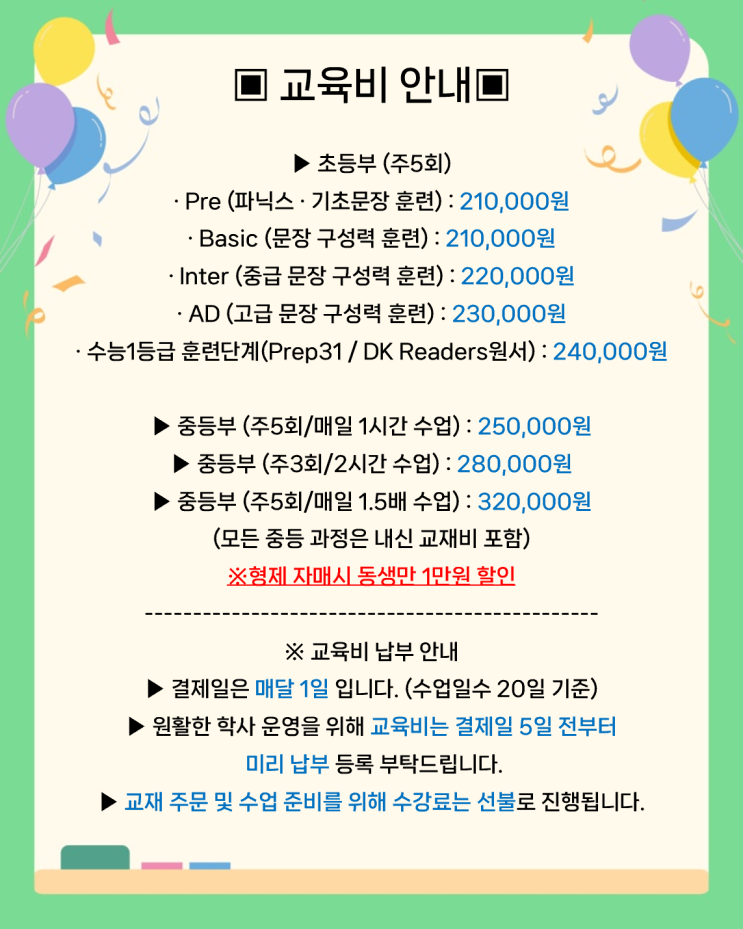 3월 신학기 수업 시간표 안내및 수강료게시