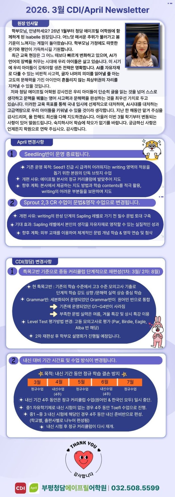 안녕하세요? 부평지역 상위 1% 학생들을 위한 기초 알파벳부터 공부하는 7세부터 특목, 자사고, 일반 수능 준비하는 중학교 3학년까지 ~~~!!! 부평지역, 산곡동, 가좌동, 청천동, 십정동, 갈산동, 부개동까지 차량 운행이 되고 있는 #부평청담어학원 #부평에이프릴 입니다 !!! 3월 봄학기 개강을 맞이하여 바뀌는 부분에 대한 안내문을 올려드리니 내용 참고 부탁드립니다! 청담어학원과 에이프릴어학원 달라지는 내용에 대해서만 따로 올려드리겠습니다! 청담어학원 달라지는 부분 요약! 특목고반 기준으로 중등 커리큘럼 단계적 재편성 내신 대비 기간 시간표 및 수업 방식에 대한 변경 에이프릴 어학원 달라지는 부분 요약! Seedling반 운영 종....... <img src="https://blogthumb.pstatic.net/MjAyNjAyMjRfMjQ1/MDAxNzcxOTA3NDkyODg4.90mf7lJXn9osPvapFpgU5f_OnBVxMi7KzCVnpp9ZxxQg.XyzX7d-R1-sX9DzR7DGCAsHnZvz221xV7tSNsxvzesMg.JPEG/News_Letter_%28%C7%D1%C0%E5%29.jpg?type=s3" />
