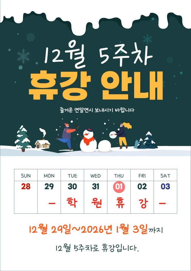 본학원 12월 29일 ~ 2026년 1월 3일까지 휴강 <img src="https://blogthumb.pstatic.net/MjAyNTEyMjdfMjg5/MDAxNzY2ODI0MDQ1NzQ5.9SYlz8mhIJzdgH5H5qKCwe7uD2mr0fD4VeiAGeVX1o0g.eVP1FzqJ6kJ9a5fSGENBJUX55EDjlbm3j4EXaLkLeYsg.JPEG/2.jpg?type=s3" />