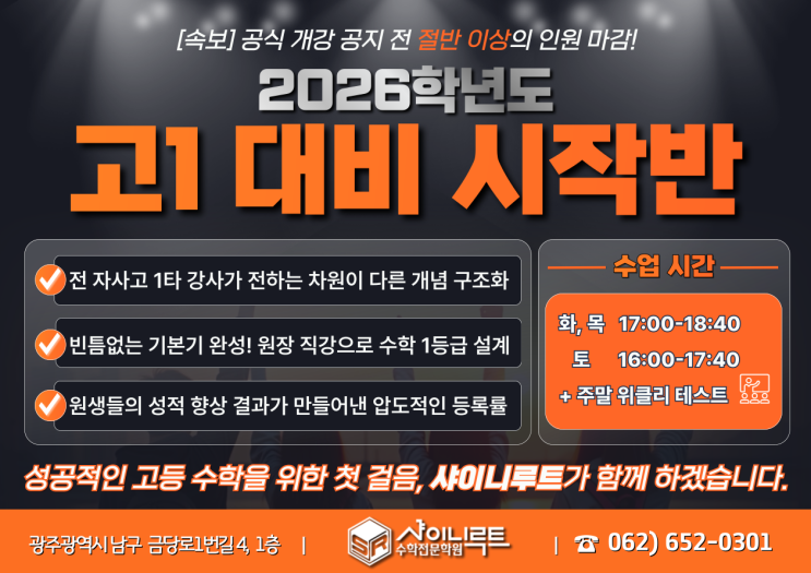 안녕하세요. 광주 진월동에 위치하고 있는 샤이니루트 수학전문학원 입니다. 가을부터 쏟아진 학부모님과 학생들의 폭발적인 문의로 개설 요청이 쇄도했던 2026학년도 고1 대비 공통수학 시작반이 드디어 12월 11일(목) 개강을 확정 지었습니다. 기다려주신 모든 분들께 진심으로 감사드립니다! 역시 다르다! 지금까지 만나본 수학 선생님 중 최고다! 등의 후기와 함께 재원생들의 압도적인 성적 향상 및 높은 만족도 덕분에 많은 학부모님들의 신뢰를 얻고 있습니다. 실제로 현재 운영 중인 타 학년 반들은 인원이 가득 차 추가 등록을 받지 못하는 반이 절반 이상입니다. 이러한 신뢰를 바탕으로, 이번 12월 개강하는 예비 고1 공통수학반 역시....... <img src="https://blogthumb.pstatic.net/MjAyNTEyMDNfMiAg/MDAxNzY0NzU4NjA0Njk3.NPBHRI_rTJE7jkRldwH-BUMZtXIaHX0N1d7g6AiglTwg.WAaC9r8cssICj-3mQAvKRC-8QToQ5uVF9R37OZhpZDAg.PNG/%BF%B9%BA%F1%B0%ED1-%B0%B3%B0%AD-001.png?type=s3" />