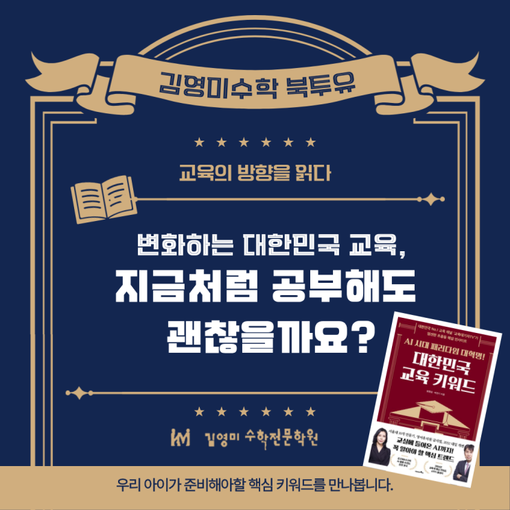 안녕하세요. 용봉동 수학학원인 김영미수학입니다. 요즘 교육이 바뀌는 속도가 정말 빠르죠. “AI가 들어온다”, “평가 방식이 바뀐다”, “대입이 또 바뀐다” 이야기가 한꺼번에 쏟아지니 학부모님들은 더 헷갈릴 수밖에 없습니다. 『 AI 시대 패러다임 대혁명! 대한민국 교육 키워드』 책을 바탕으로, 지금 교육의 큰 흐름을 정리해 보겠습니다. AI가 교실로 들어왔다 공교육 현장에서 AI 기반 학습 플랫폼이 도입되고 수업과 평가 방식도 빠르게 변화하고 있습니다. 그리고 AI 기반 맞춤 학습 시스템이 실제로 운영되고 있습니다. 정보가 많아질수록, ‘해석하는 힘’이 더 중요해집니다. 우리는 무엇을 알고 준비해야 할까요? 대한민국 교....... <img src="https://blogthumb.pstatic.net/MjAyNjAyMjZfMTI2/MDAxNzcyMDQwOTQzNjk3.Vor1yV4UhvdEZQ0pZvIsF4i2cL4LjTxEyCdOnIToLc0g.e-5Npy1UehlRB0DgsDkKXq6HRmZ6DGF_QkQZa9m_fwcg.PNG/%C1%A6%B8%F1%C0%BB_%C0%D4%B7%C2%C7%D8%C1%D6%BC%BC%BF%E4._%287%29.png?type=s3" />