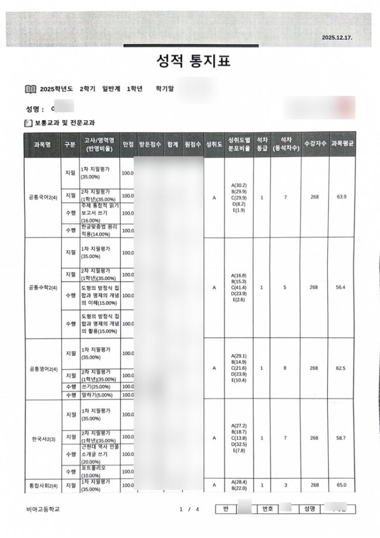 드디어 성적표가 나오고 있습니다. 이번에 많은 학생들이 성적이 올라서 너무 기분이 좋네요. 수학이 중간 2등급이었는데 1등급으로 오른 학생이 2명이나 있고 3등급인 학생들도 대부분 2등급으로 올라서 참 다행이다 생각합니다. 4연속 ALL 1등급 여러분 생각보다 올 1등급이 쉬운 건 아닙니다. 학교별로 상위권 경쟁이 다르고 과목별로 편차도 있습니다. (특정 과목만 잘하는 학생이 몰릴 경우..) 이번에도 비아고1학년 이** 학생이 올 1등급을 받아왔습니다. 비아고에서 잘 길러서 좋은 대학교 보내주셨으면 좋겠네요. 빛나는 노력의 끝은 올 1등급 장덕고등학교 1학년 김** 학생 아쉬운 한국사 하지만 중간 때 잘 봤으니깐!! 아마 합산 1등급....... <img src="https://blogthumb.pstatic.net/MjAyNTEyMjJfMTQ1/MDAxNzY2NDEzMDQyMTQx.Ich9H2U4ATjU9tB0562ERpzC7GiesB_P15zEk_rb21Ug.r5AaOWbvBOs1aUW4__e9DkWS8lwfryGzvHcHDHNygjQg.JPEG/25년_2학기_합산_비아고1_이혜빈_성적표_1.jpg?type=s3" />