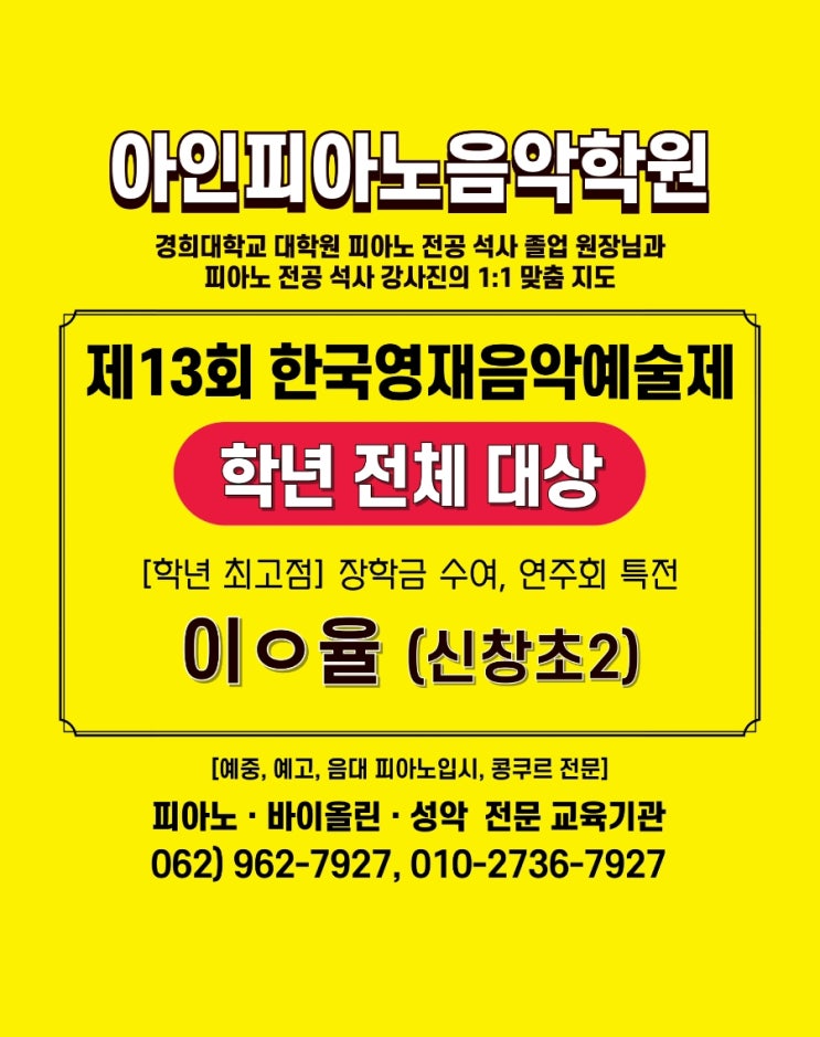 #한국영재음악예술제 #저학년대상 #학년전체대상 #광주피아노대회 #신창동아인피아노 "아인피아노음악학원" • 경희대 음악학과 피아노전공 석사 졸업 원장님과 • 피아노 전공 석사 강사진이 지도합니다. ❤당일 경연 후 학부모님들의 메시지❤ ✅제13회 전국서석예술제 링크 ❤아인피아노만의 특별한 수업 피드백❤ ❤ 학부모님들의 소중한 후기 ❤ ❤ 아인피아노 대회반 친구들은 대회곡만 연습하는 것이 아니라, 무대에 올라섰을 때 어떻게 행동해야 하는지까지 함께 배우고 있습니다. 의자 위치 조정부터 인사, 연주 전 마음가짐까지 모든 과정을 스스로 해낼 수 있도록 지도하며 무대에서도 흔들리지 않는 자신감을 키워가고 있....... <img src="https://blogthumb.pstatic.net/MjAyNTEyMjZfMjE5/MDAxNzY2NzU3NDE0ODg0.CHlUtqN4AM62xAnqeT5waiyPwNf-VJxNsamRkaK52kYg.4JJsXhlS5ZM0X-cDeRwDt0RTciFvZTMlDH2TnNmVu8Qg.JPEG/900%A3%DF1766315408382.jpg?type=s3" />
