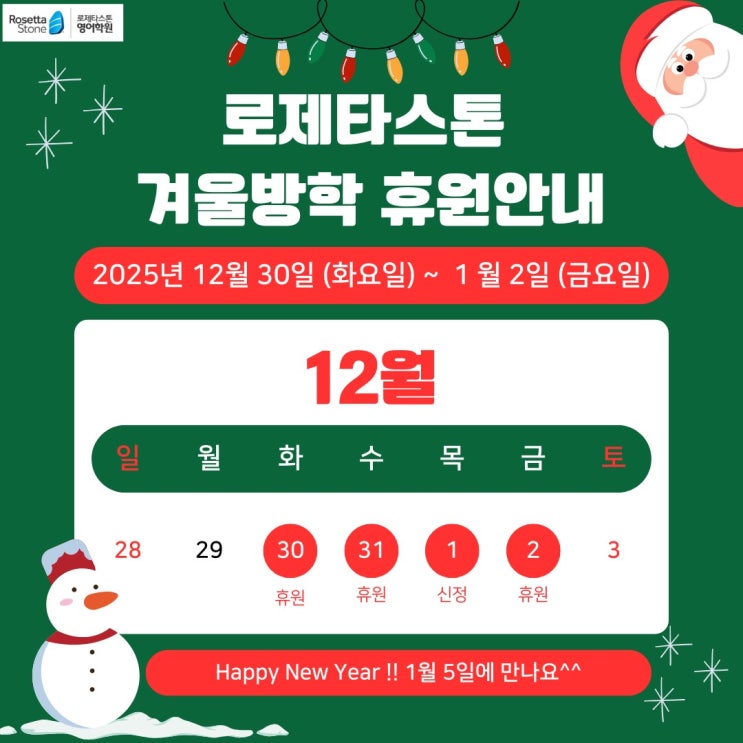 로제타스톤영수학원 겨울방학 휴원 안내 안녕하세요. 아이 한 명, 한 명의 성장을 소중히 생각하는 로제타스톤영수학원입니다. 2025년 한 해 동안 학원에 보내주신 신뢰와 응원에 깊이 감사드리며, 겨울방학 및 연말을 맞아 아래와 같이 휴원 일정을 안내드립니다. 겨울방학 휴원 기간 2025년 12월 30일(월) ~ 2026년 1월 2일(금) 해당 기간 동안에는 ✔ 모든 정규 수업 ✔ 보충 수업 및 상담 ✔ 학원 방문 업무 가 진행되지 않습니다. 정상 수업 재개일 2026년 1월 5일(월)부터 정상적으로 수업이 진행됩니다. 이번 짧은 휴원 기간은 아이들과 학부모님 모두가 한 해를 차분히 정리하고, 새해를 새로운 마음으로 준비하는 시간이 되기를 바라는....... <img src="https://blogthumb.pstatic.net/MjAyNTEyMjZfMjUy/MDAxNzY2NzIzMzc2OTA0.JJrcHsmLs2dqV4TtuP007UGphMheb48_fXbIioksjT8g.AUAuKQWdIN-iI4bF1lhgfiSQma_ffmsqwLay7EykK8Qg.JPEG/KakaoTalk_20251226_132849.jpg?type=s3" />