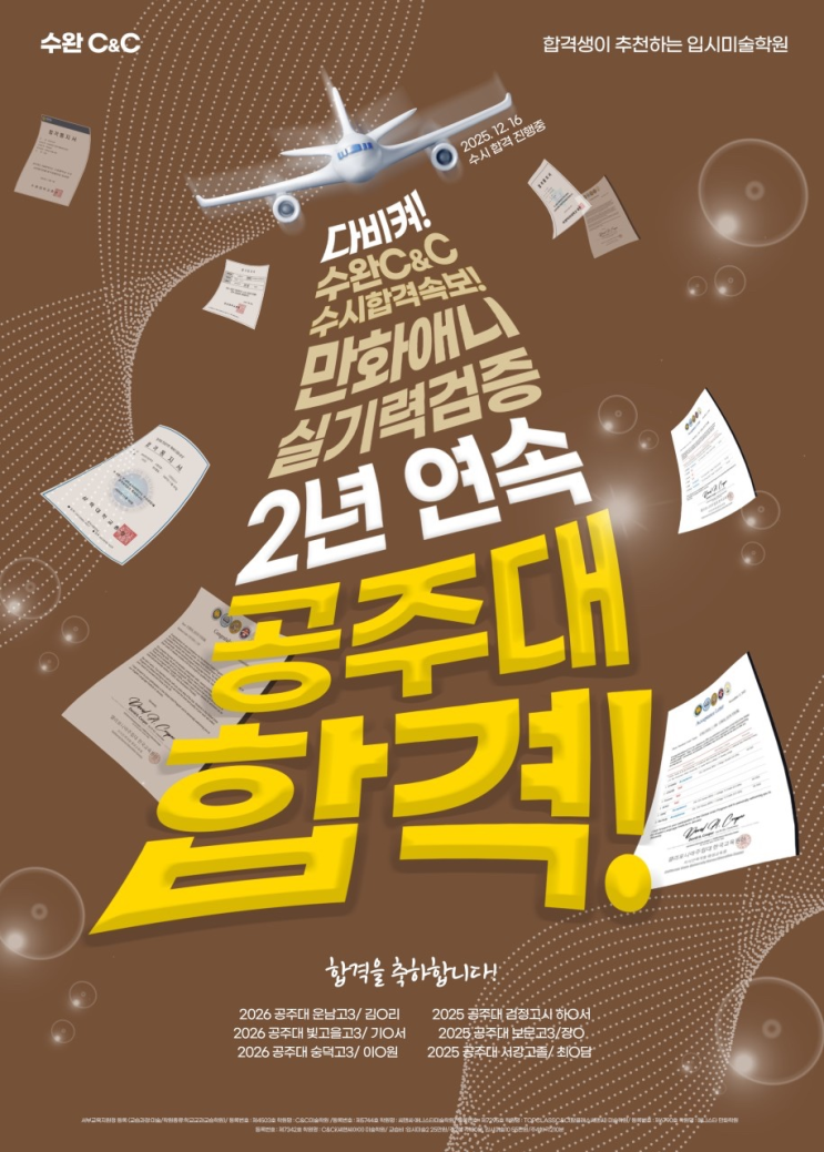 안녕하세요 여러분 오늘 포스팅할 내용은 광주 씨앤씨 미술학원 광주본원 수완 C&C미술학원에서 공주대 합격을 하였다고 합니다~! 광주 씨앤씨 미술학원 광주 본원 수완 C&C미술학원 학생 공주대 합격! 축하드립니다 광주 씨앤씨 미술학원 광주 본원 수완 C&C미술학원 공주대 만화 애니메션학부 합격 꾸준히 증명되는 합격률! 합격자 학생의 평소작입니다 광주 씨앤씨 미술학원 광주 본원 수완 C&C미술학원에서는 실기력을 향상시키기우해 단순 반복이 아니라 학생 개개인에 맞춰 커스트마이징 하고있습니다 내신 5등급으로 한예종 1차 합격 광주 씨앤씨 미술학원 광주 본원 수완 C&C미술학원 한예종 1차 합격을 축하드립니....... <img src="https://blogthumb.pstatic.net/MjAyNTEyMjZfNzMg/MDAxNzY2NzMxODQ3OTI0.8z9eGoLAAVq1caUxTzvUCjM7BzagCE10qdcye2d7LF4g.4QT7LfT3P1wxnrDK7KX2KxDu3haLGPl-JsYR-K5pnDQg.PNG/image.png?type=s3" />